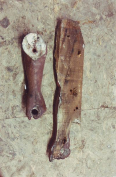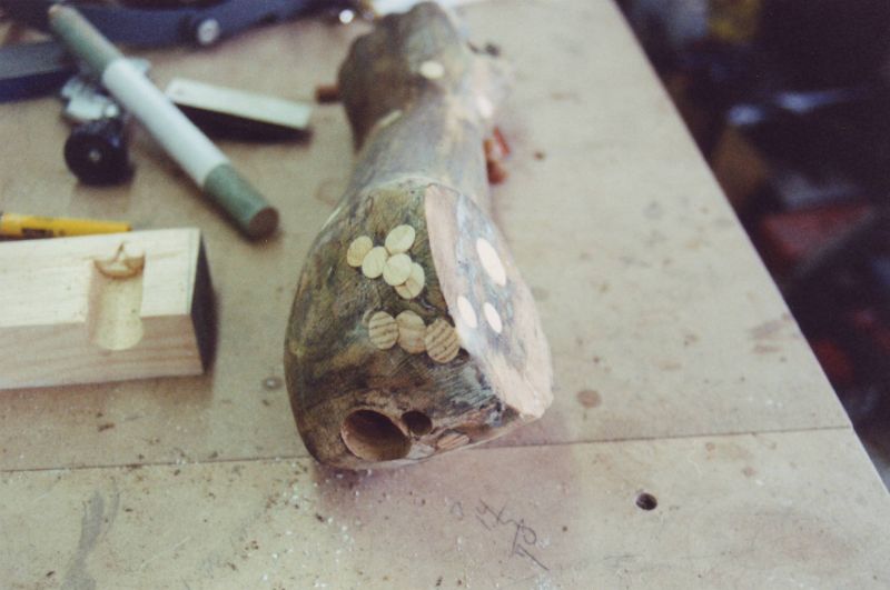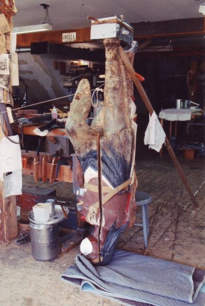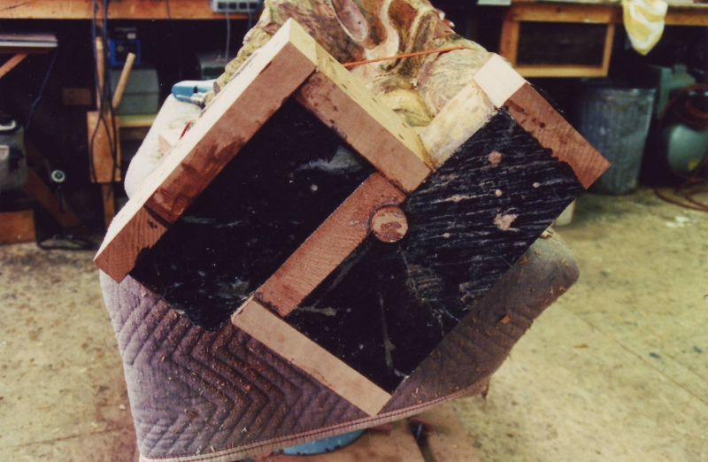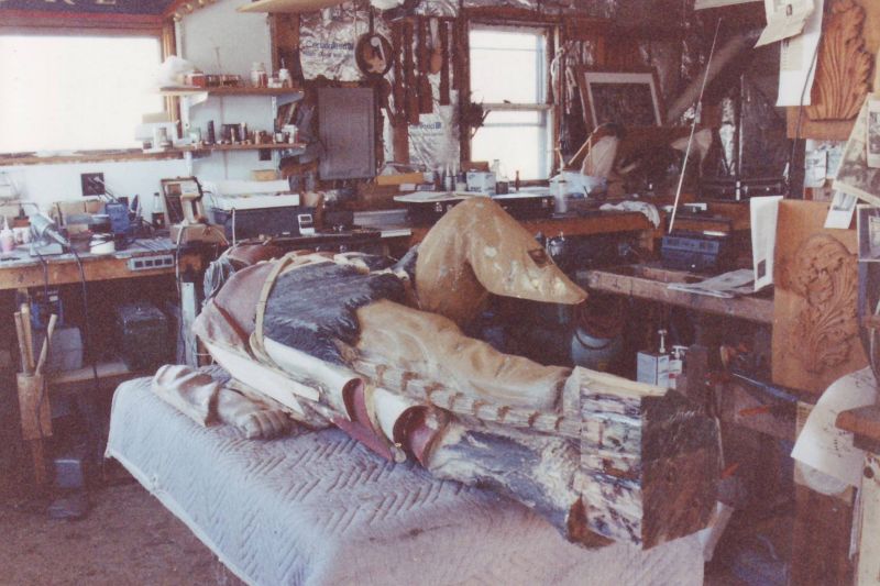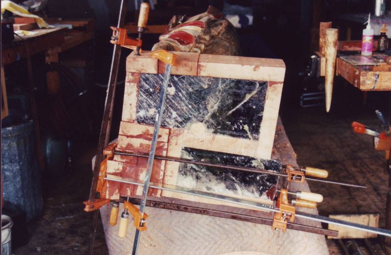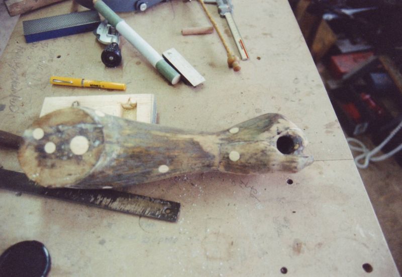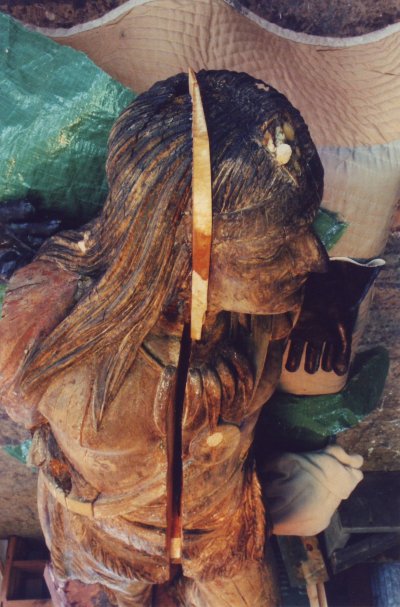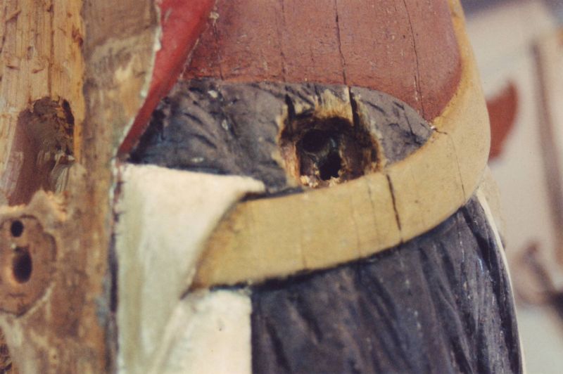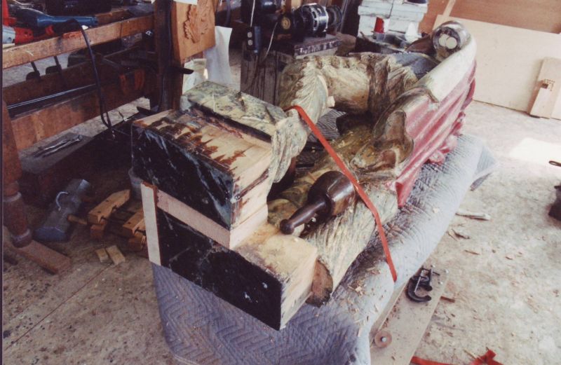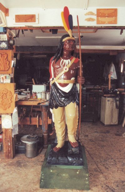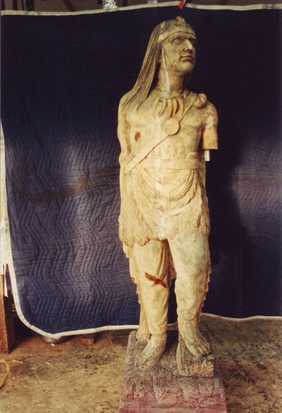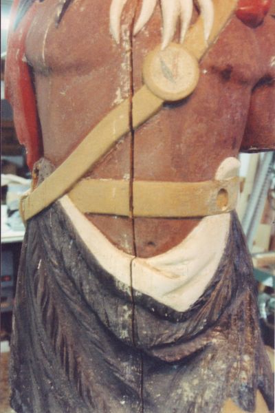 This beautifully carved wooden Indian was and still remains an historic icon of the The Museums of Old York. After many years of faithful service on the front lawn of one of the museum's prize properties, the Elizabeth Perkins House, he needed a bit of work. The carving was x-rayed by York Hospital to locate for removal all of the screws, nails, bolts and metal that had been used in past repair jobs. I was given a free hand in the restoration of this magnificent piece with the idea that it would be going back to his place on the banks of the York River and be able to withstand the elements for another 100 years. |