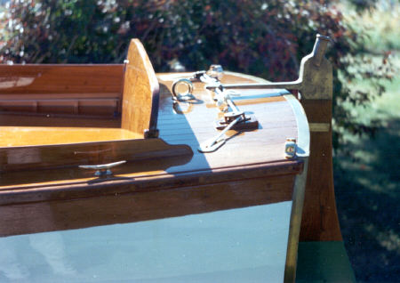 | The launch to the yacht Felicia was a little over 15 feet long and lightly built with three eighths inch thick cedar plank riveted to 5/8 inch square frames. All of the bright work is teak. I replaced 16 frames, 2 floor timbers, two planks, teak cockpit combings, all of the floor boards, the engine, the engine box and its hatch. All of the seams were reefed of their calking and all bungs (wooden plugs) were popped off to expose the rivet heads. The planks were tightened to the frames by bucking up the rivets on the outside of the planks and peening them down tight on their roves on the inside of the frames. Every fastener on the boat, including the keel bolts were tightened in this fashion. She was then primed, calked, painted and varnished. The edges of the stern were re-capped with brass plate as was the cut water on the bow. These brass caps were held on the same way the originals were - by small screws that were just slightly counter sunk into the brass and then ground off flush to the face of the caps and polished to a high shine. They looked like flush rivets when they were completed. |